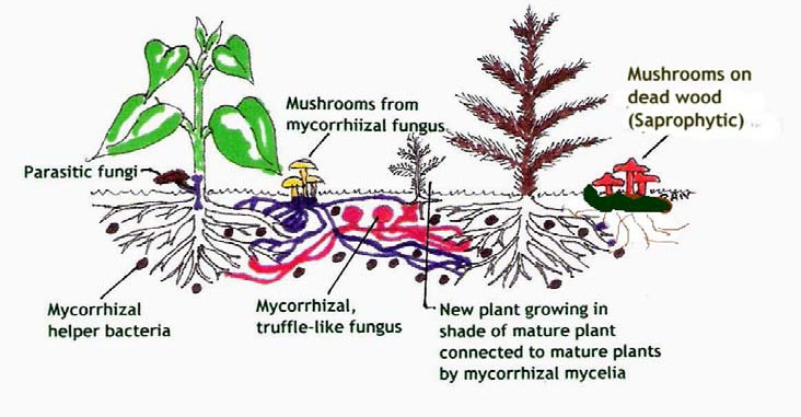 The mushrooms from the mycorrhizal fungus are shown linking several plants. The buried fruiting bodies of a mycorrhizal, truffle-like fungus also can connect several plants. The mycelium of yet another mycorrhizal fungus can form fruiting bodies on dead wood (saprophytic mushrooms).