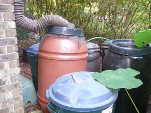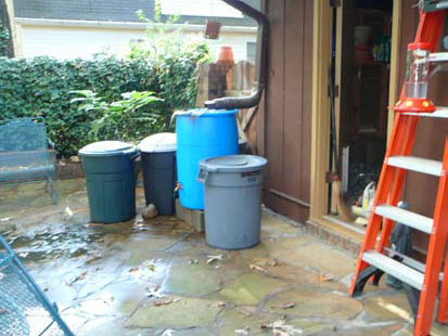 Here is a photo of the rain barrel on the patio with overflow going to the trashcans (Give me a break- I think the trashcans give it an attractive but nice quirky look!). Usually these fill up after a single day’s rain. I have 3 stations like the one shown.