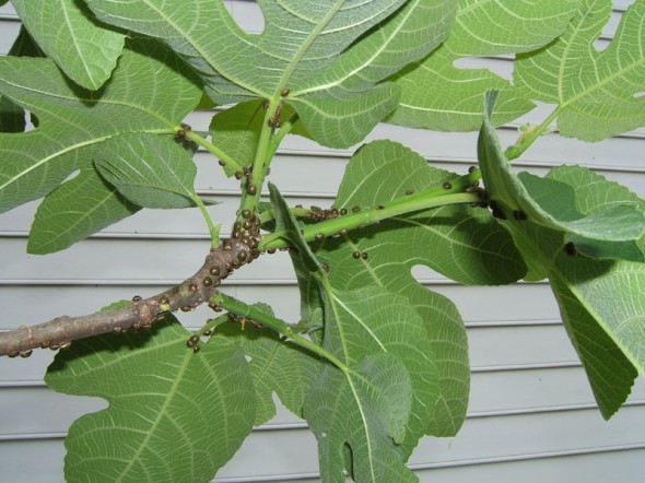 Over a period of a few weeks the bugs slowly left my fig tree and probably started feeding on Kudzu as it steadily greened up. They obviously prefer legumes to figs. But, once my string beans and soybean plants started growing the bugs were back. They seem to favor the stems as I have not seen them on the bean pods or the green figs.