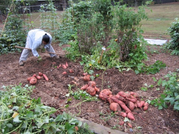 Spring bulbs were added today at the main parking lot entrance. Our big fall rennovation of the Farm House foundation shrubs included the use of the park’s tractor and a lot of help from the park’s maintenance heroes, Joe and Juan. This was our first year planting sweet potatoes in the main demonstration garden plot. The potatoes were huge. Lesson learned – harvest a little sooner next year.