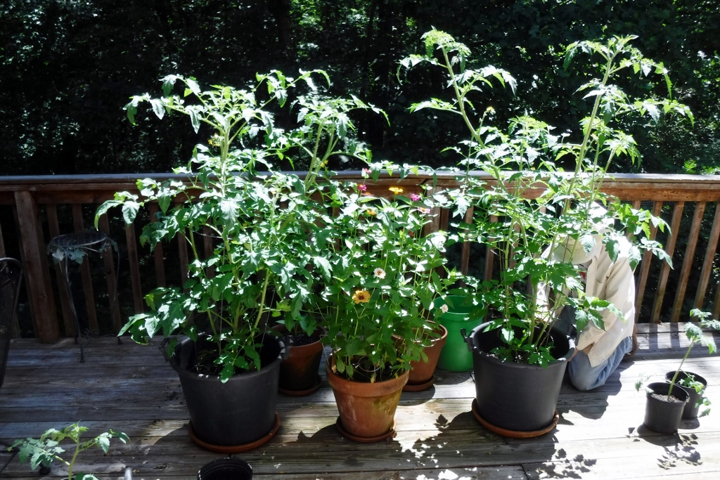 "Checking for Tomatoes in Deck Garden"