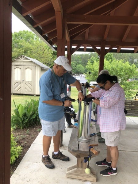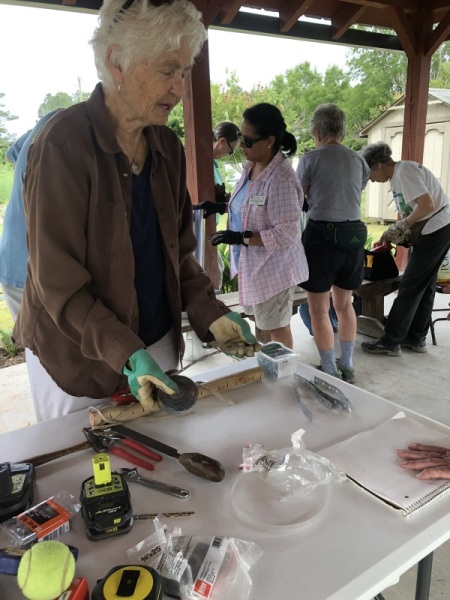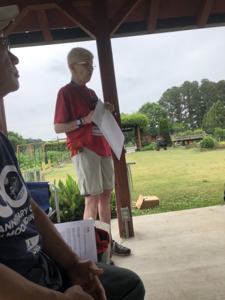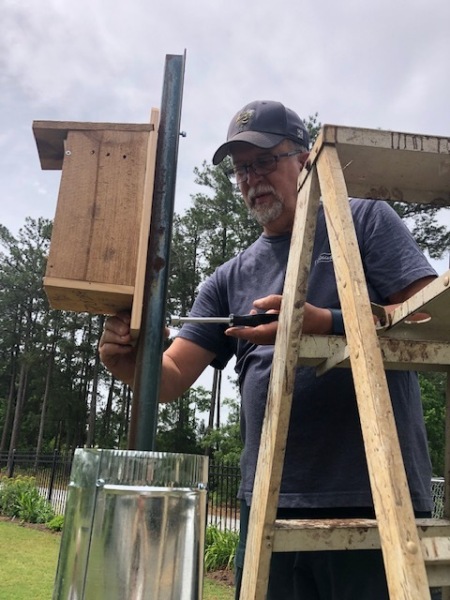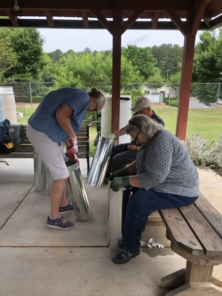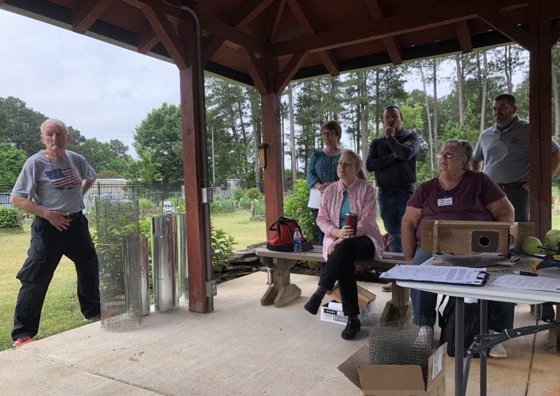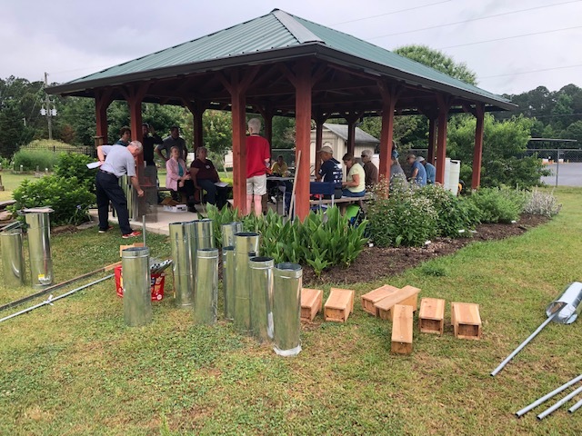 Seventeen of us had a great morning at the Community Garden at Snellville learning how to make predator guards for bluebird houses. These guards prevent raccoons, squirrels, and snakes from reaching the nests. Terry Dempsey (GPLT) and Carol Hassell (GCMGA & GPLT) let the teaching and all of us shared in the different parts of building these guards. This year’s grant was part two of raising awareness of the importance – and enjoyment – of having bluebirds in our environment. The houses were built last year in July. The Community Garden received a second bluebird house and it was installed today by Wes Nettleton and Martha Whitman. Other houses are going to other community gardens, butterfly gardens, parks and schools.