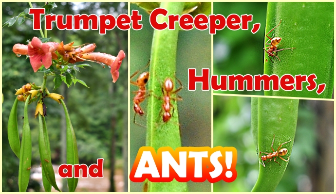 Finally, in its third year, we have a consistent trumpet vine bloom, but the hummingbirds do not frequent it! @#$%^&* Why not? I sit in my little spy position, waiting to get a picture of a hummer frequenting a flower, which never happens. They visit other flowers. I don’t spray poisons. The answer came in a recent post in Terry Johnson’s Backyardwildlifeconnection blog. It seems hummingbirds can smell the trail of insects that can hurt them, including the formic acid of ants!